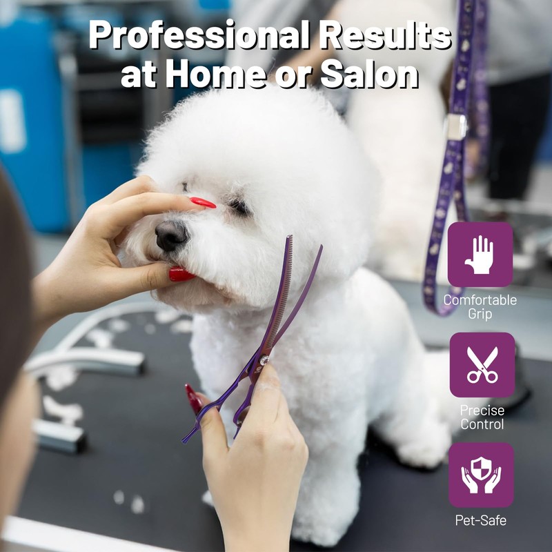 The ergonomic, non-slip handle ensures comfort during long grooming sessions, while the elegant purple finish adds a stylish touch to your grooming toolkit. Choose these curved dog scissors for grooming and give your pet the polished look they deserve