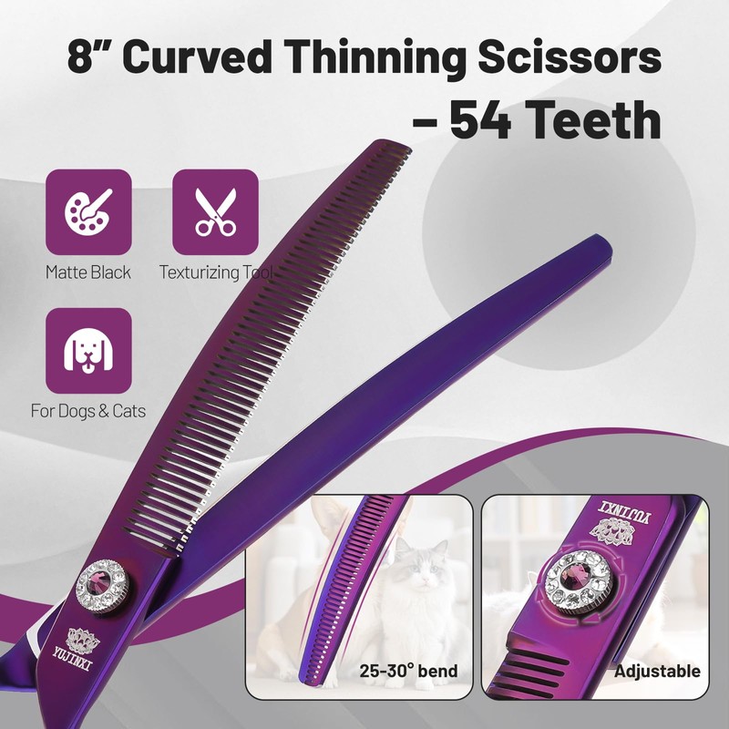 - Pet Curved Thinning Scissors These dog grooming scissors feature curved blades with 54 teeth, designed for blending thick coats, removing bulk, and creating natural transitions with smooth finishing