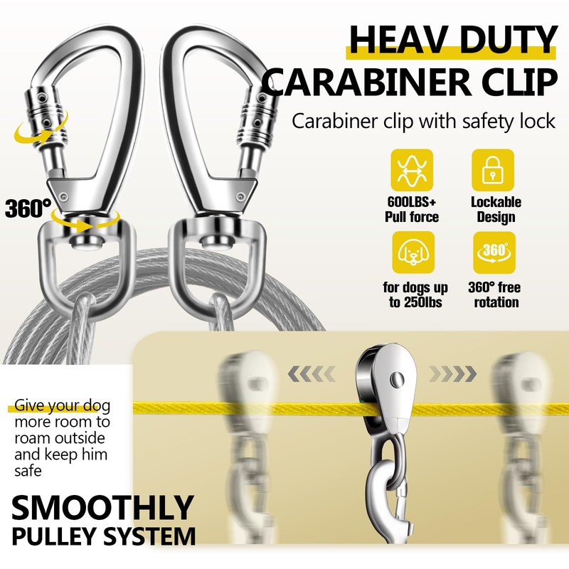 - 【Upgraded Excellent Quality】The heavy duty outdoor overhead trolley system is made of 5mm diameter stainless steel wire that resists chewing and rusting, providing extra strength and durability for large dogs weighing up to 250 pounds. The screw hooks are 15% larger and thicker to ensure secure screwing to a tree or wall and prevent large dogs from pulling.