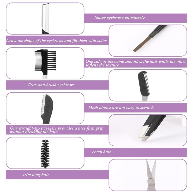 - 【Value Pack】Package contains 2pcs eyebrow razors, 1pcs eyebrow pencil, 1pcs eyebrow comb, 1pcs eyebrow brush, 1pcs tweezer, 1pcs scissor, 1pcs curved thinning scissors, enough to meet your needs
