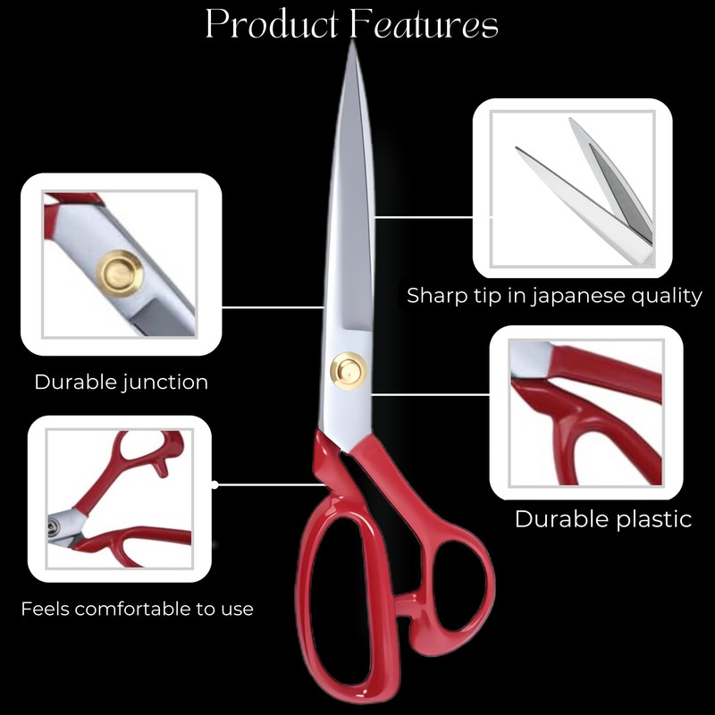 These professional fabric scissors are the ultimate cutting tools for tailors, dressmakers, and leather crafters. Crafted with high-carbon steel blades and industrial-strength construction, they effortlessly slice through even the toughest materials like leather and multiple layers of fabric. Available in five different sizes (8'', 9'', 10'', 11'', 12''), these stainless steel scissors provide precision cutting for all your needs. These heavy-duty sewing shears are sharp, durable, and designed for precision, ensuring clean cuts every time. Whether you're a professional tailor or a hobbyist crafter, these scissors are an essential addition to your toolkit for all your cutting needs at home or in the office. With their ergonomic design and superior performance, they'll become your go-to cutting companions for years to come.