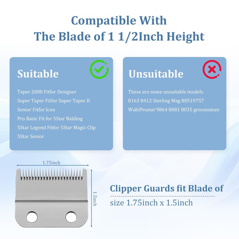 • Warm Tips: If you are not sure wether this clipper guards fit with your trimmer, pls measure the blade sizes. Fits 1-5/8" to 1-3/4" Wide Blades.