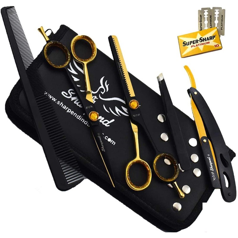 - Package Included: 1 x Regular hair scissors; 1 x thinning scissor; 1x Barber Razor; 1 x grooming comb; 1 x free case; 1 x Tweezers; 1 x Pack Blades