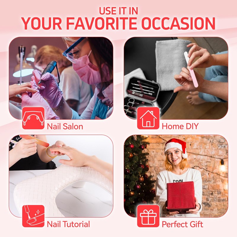 - ERGONOMIC DESIGN: Our nail armrest features a 15° ergonomic tilt for maximum comfort during long manicure sessions. The ample size (18x12x7in) fits almost all types of manicure lamps, providing a comfortable experience whether you're relaxing or using your phone