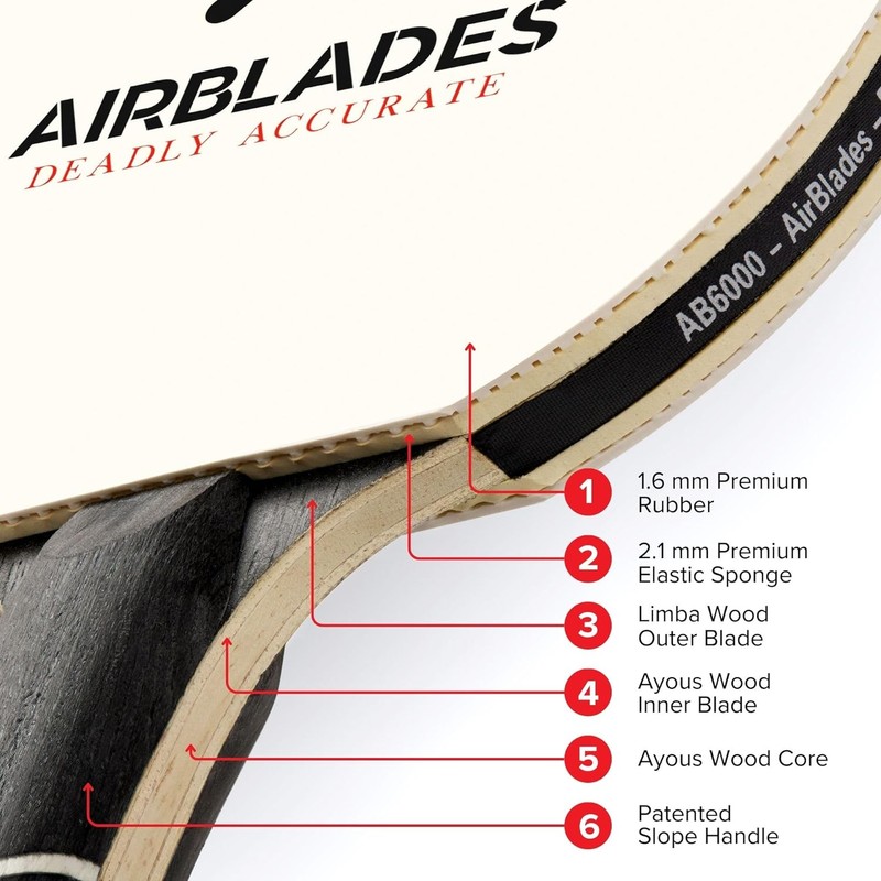 OUR STORY How we got our start? My name is Allan Say, Founder of AirBlades. I am a ping pong/table tennis lover who has grown up playing table tennis in my garage with my dad & friends my entire life. Out of my genuine passion for the game, and obsession in creating the perfect ergonomically designed blade, I saw a niche in the market and started my journey into what is now know as "AirBlades". What makes our product unique? Our fully patented AirBlades Table Tennis Racket features a uniquely shaped handle that contours to your hand and sits a lot more comfortably than the traditional straight or flared handle. The Slophandle is fully patented in the USA, EU, UK and Australia and soon India, so we are the only company with this uniquely shaped design. Why we love what we do? We love innovating and creating something new for a game that we admire. We especially love to hear from other players about how much they enjoy our paddles and what a difference it makes to their game! FEATURES Custom designed ergonomic ping pong paddles suitable for players of any skill level Instantly improve your game with good grip, and precise accuracy and control Premium paddles made up of five layers of wood AB-3000 uses Ayous wood; a resilient lightweight, flexible and stiff wood excellent for close-to-the-table counter-drive play AB-5000 uses Koto wood on the exterior, transmitting a crisp and sharp vibration perfect for looping, blocking and counterattack AB-6000 uses Limba wood on the exterior, which is typically more expensive and usually found in Japanese and European blades 2mm of quality sponge and 1.6mm of high-end inverted rubber featured on every paddle Protective hard carry case included with every ping ping paddle DIMENSIONS Our Table Tennis Rackets are standard competition size. The Ping Pong Paddle measures approximately 10.4" (26.5cm) long x 5.9" (15cm) wide. The hardcover carry case is 11.4" (29cm) long x 7.1" (18cm) wide x 1.2" (3cm) deep