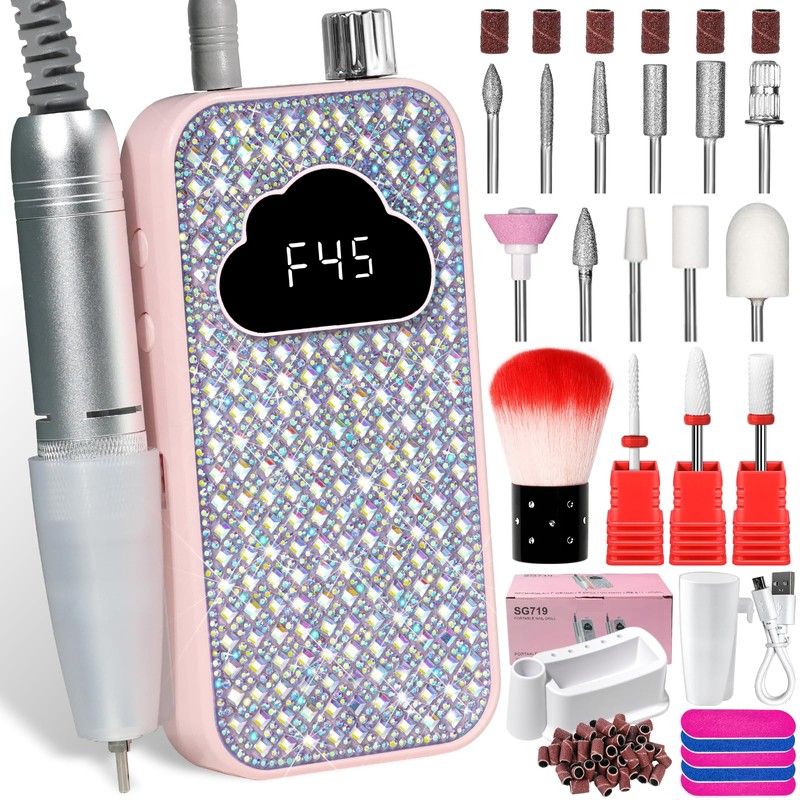 - 【Professional Glitter Design Electric Nail File】Our electric nail file features: with DIY unique design rhinestones, it has a beautiful appearance and unique design aesthetic appeal, with he well-designed intelligent LCD screen, you can easily know the information such as rotating speed RPM, rotating direction and battery power, enhancing your manicure and pedicure experience.