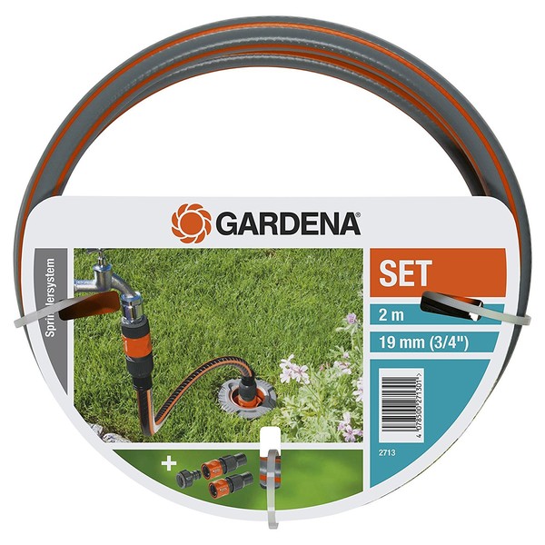 - Box contents: 1 x Gardena tap connector, 1 x adapter, 2 x professional system hose pieces for 19 mm (3/4 inch) garden hoses, 2 m flex hose (3/4 inch)