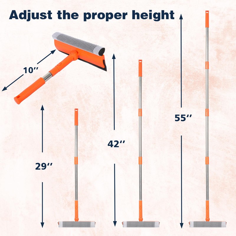 2 in 1 Function Window Cleaning Tool With 4 Section Of Extension Poles, You Can Adjust Length According To Your Needs (FROM 16'' TO 55''). Our Telescopic Window Squeegee for Window Cleaning Includes Two Parts: Rubber Strip and High Quality Sponge (10 inches). It is Convenient to Use the Sponge Scrubber to Clean Windows, the Rrubber Squeegee to Wipe Water. This All-in-One Set is All You Ever Need to Quickly and Efficiently Clean Windows, Shower Doors and Any Other Smooth Surface.This Long Handled Window Squeegee for Home Has a High-Quality Rubber That Fits Closely to the Glass Surface and Allows You to Achieve a Streak-Free Result. You Can Also Use This Window Washer to Clean Car Windows, Mirrors, Glass Furniture, and Other Similar Surfaces. tandard Proffesional Squeegee With Extra Long Handle Provides All You Need to Ensure Your Windows Stay Sparkling-Clean And Streak-Free. Ideal for Outdoor and Indoor Glass Surfaces. With Squeegee's Various Lengths, it Can Be Used to Clean Different Areas and Surfaces Both High or Low. This Tool Eliminates the Need to Dangerously Climb Ladders to Reach High Places for Cleaning, Making the Cleaning Process Much Easier and Safer. It Can Effortlessly Clean Various Surfaces Such as Cars, Bathroom Doors, Indoor and Outdoor Windows, French Windows, Wide Windshields, Balcony Glass, Mirrors, Office Glass walls, and Even Camper.