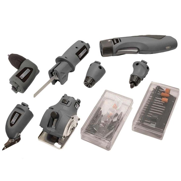 - Die grinder with 5 pcs bits, 5 pcs diamond grinding bits, Screwdriver with 6 bit, connector, Reciprocating saw with 3pcs baldes, Angle drill with 6 pcs HSS twist drills ( 0.4“-0.24”) , LED light with USB plug