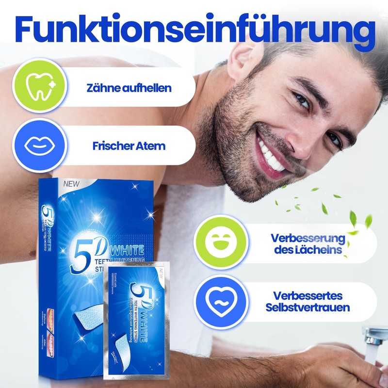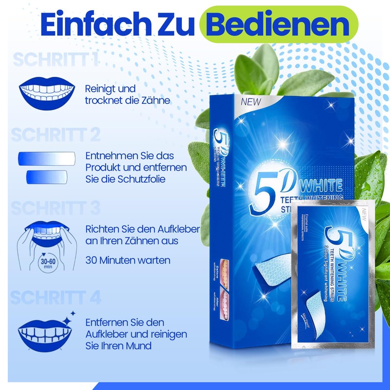 - Deep Whitening: Diese whitening strips aktiviert nach Kontakt mit Speichel schnell eine superstarke Haftkraft, die lange Zeit stabil an den Zähnen haften kann und den natürlichen Stoffwechsel der Zähne fördert, um einen durchscheinenden Aufhellungseffekt von innen heraus zu erzielen.