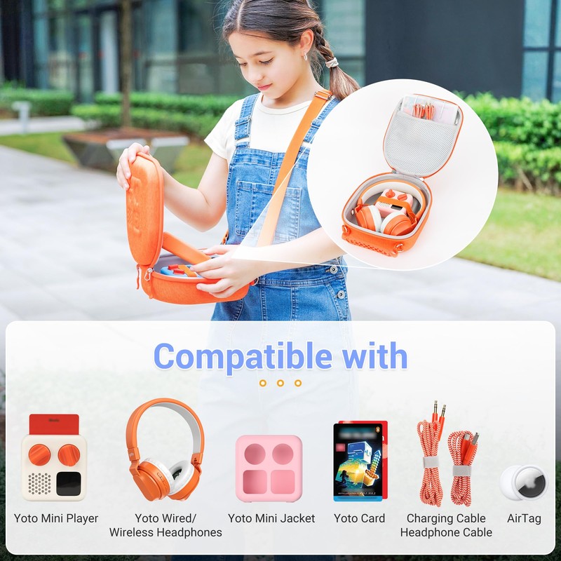 PROfezzion Travel Case for Yoto Mini with Headphones, Hard Shell Carrying Case with Adjustable Shoulder Strap, Holds Mini, Headphones and Up to 24 Audiobook Cards - Orange