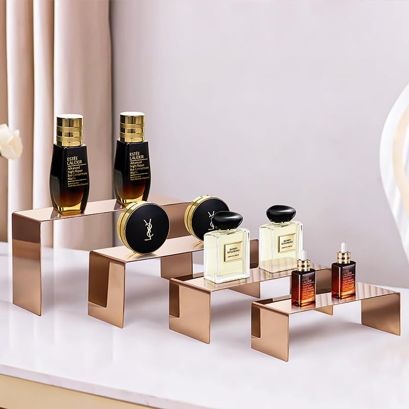 PROFIKLA 4 Pcs Stainless Steel Display Risers, Display Stand for Display Cupcake Dessert Perfume Purse Handbag Shoe and Funko Pop, Rose Gold