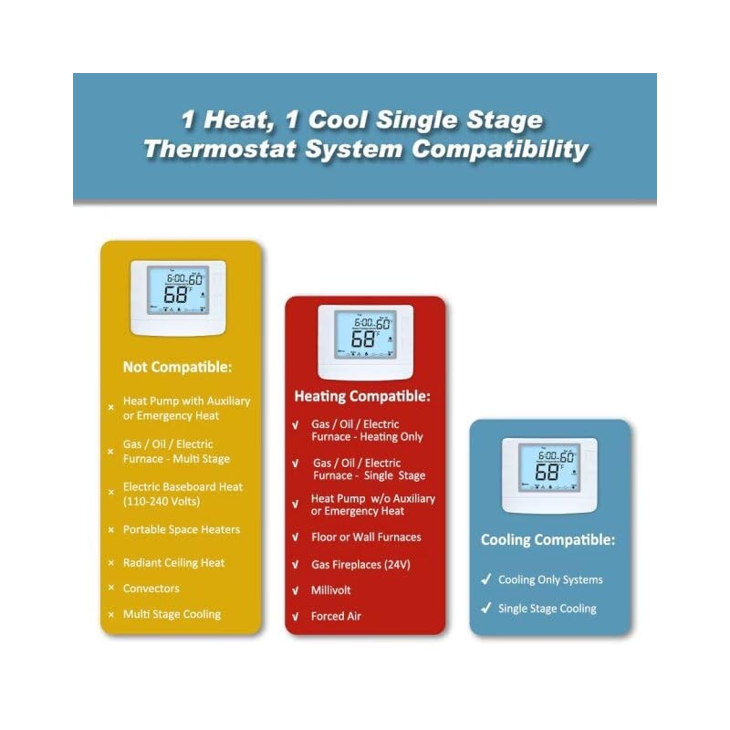 • · High Compatibility: Forced air (gas, oil or electric), Electric furnace, Hot water steam or gravity radiant heat, Heat only systems, Heat pump w/o auxiliary or emergency heat, Millivolt, Gas fireplaces (24V), Floor or wall furnaces, Cool only systems.(TIP: Before purchasing, check to see if this thermostat is compatible with your system.)
