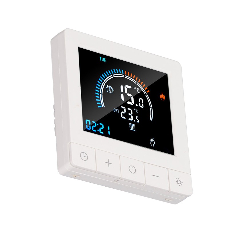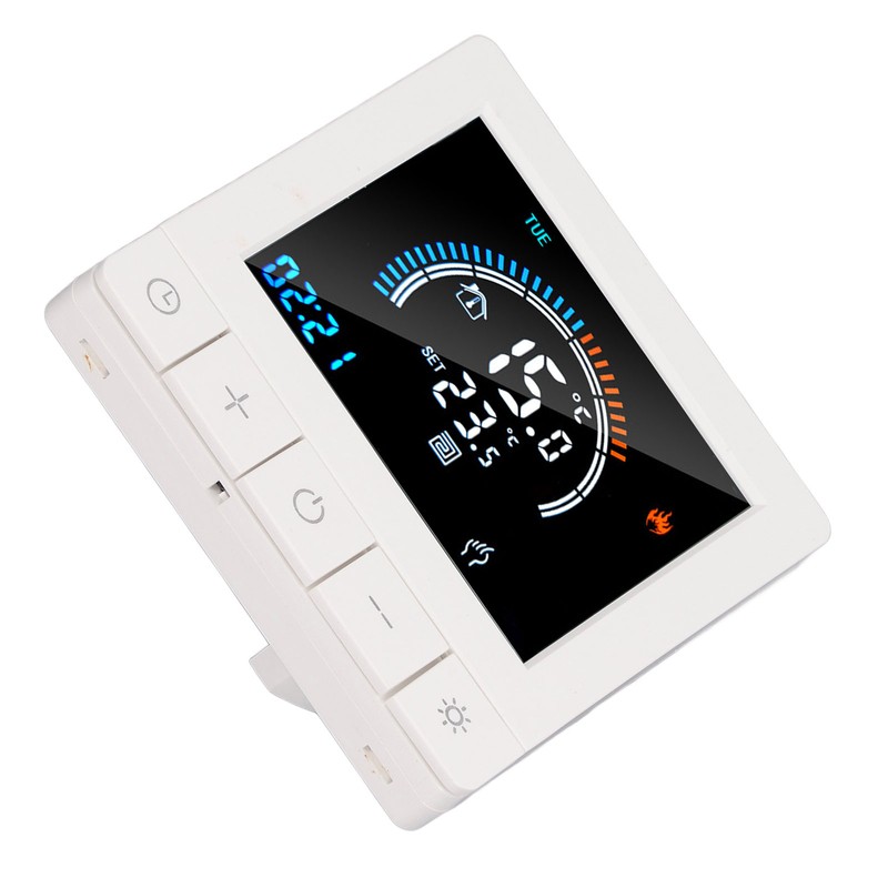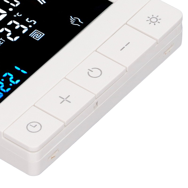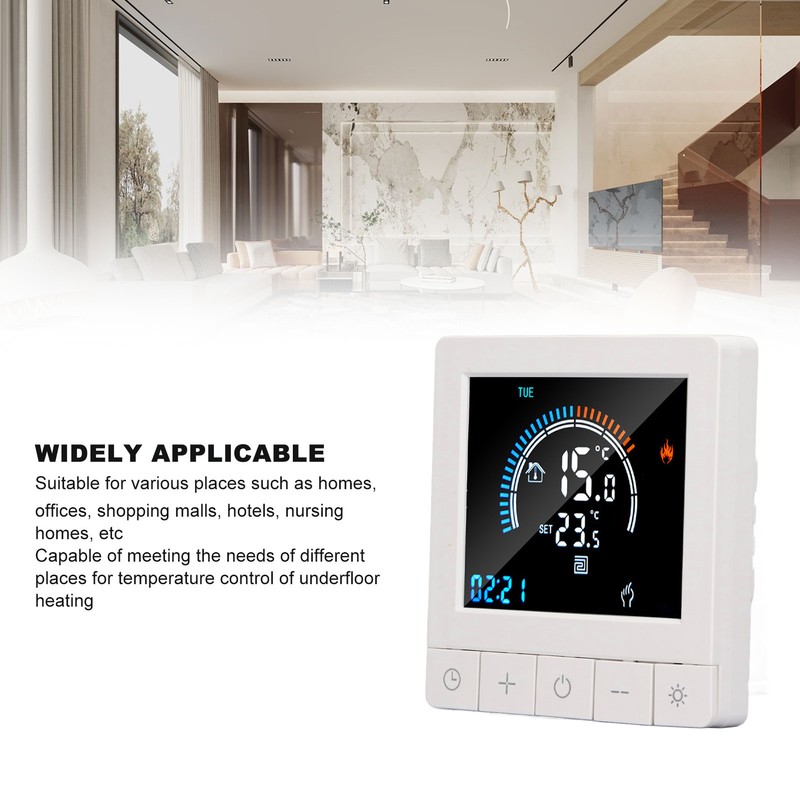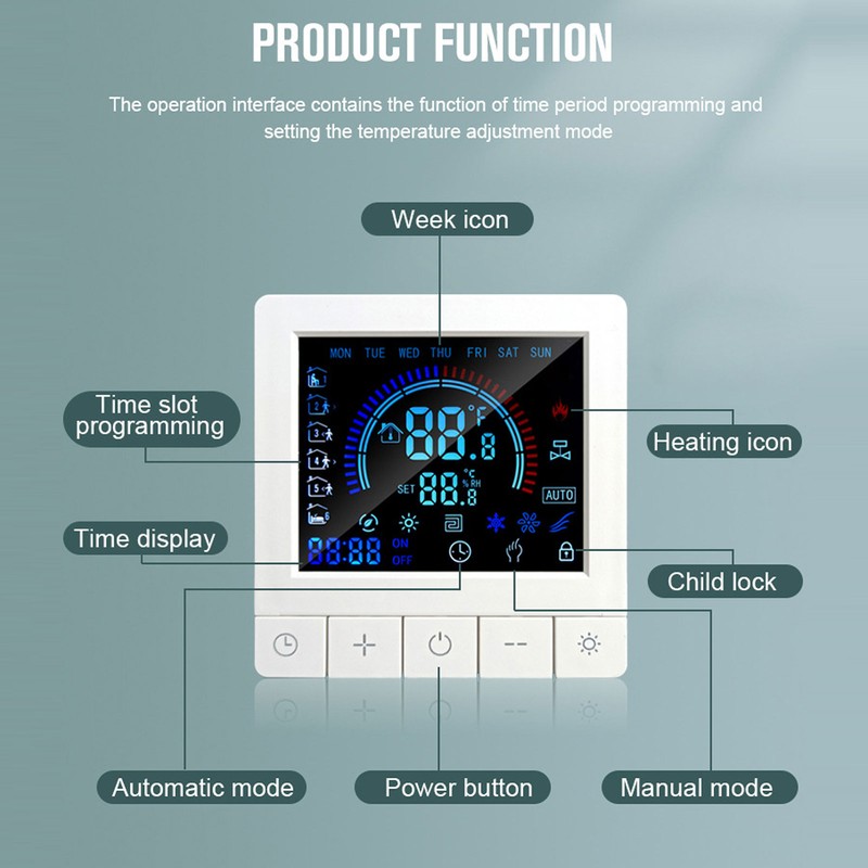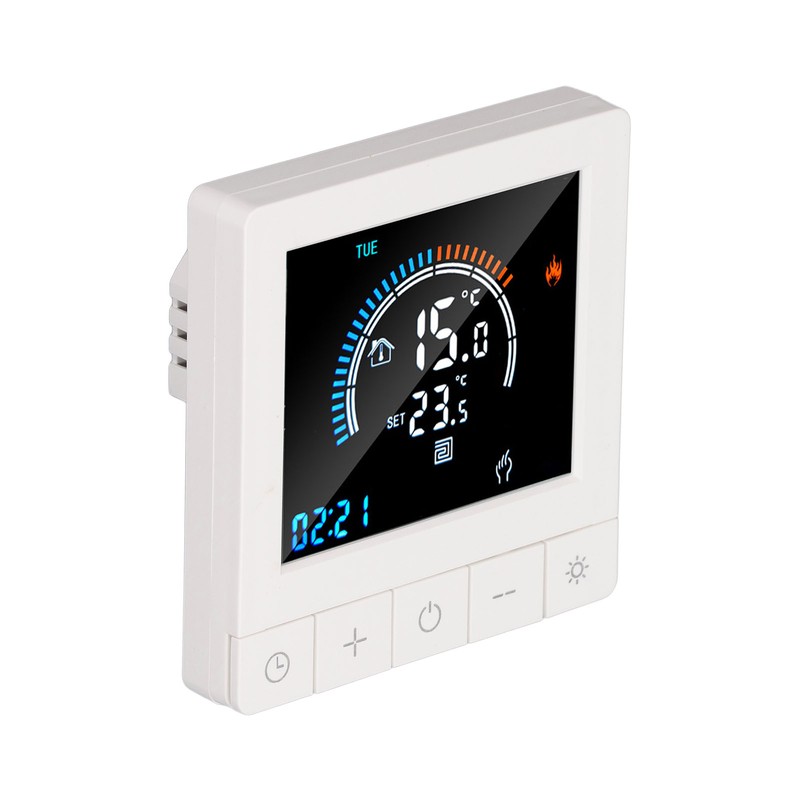 1、Intelligent LCD Display: This smart thermostat is equipped with a LCD display screen, which can clearly display information such as the current room temperature, set temperature, and working mode, making operation more intuitive and convenient. 2、Programming Function: This smart thermostat has programming function, allowing users to set different temperatures at different time periods according to their own needs, intelligently controlling floor heating, improving comfort while saving energy. 3、Intelligent Temperature Control: This programmable smart thermostat is designed specifically for smart homes and can accurately control the floor heating temperature to avoid overheating or overcooling, providing a comfortable indoor environment. 4、Widely Applicable: This programmable smart thermostat is suitable for various places such as homes, offices, shopping malls, hotels, nursing homes, etc., and can meet the needs of different places for floor heating temperature control. 5、Practical And Decorative: This smart thermostat for home has a beautiful appearance and is equipped with a color LCD display, which is not only practical but also decorative, adding a sense of fashion to the place.
