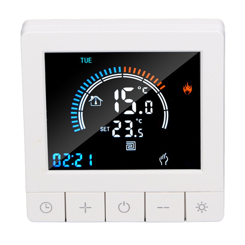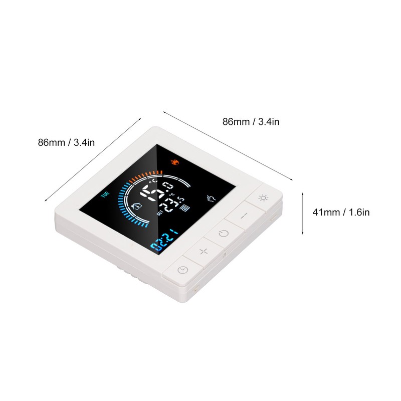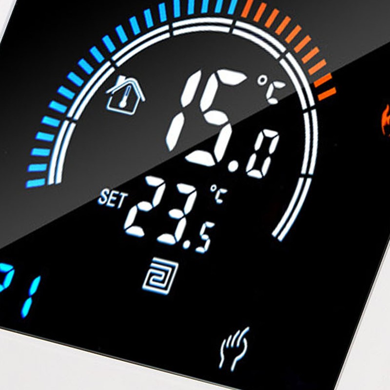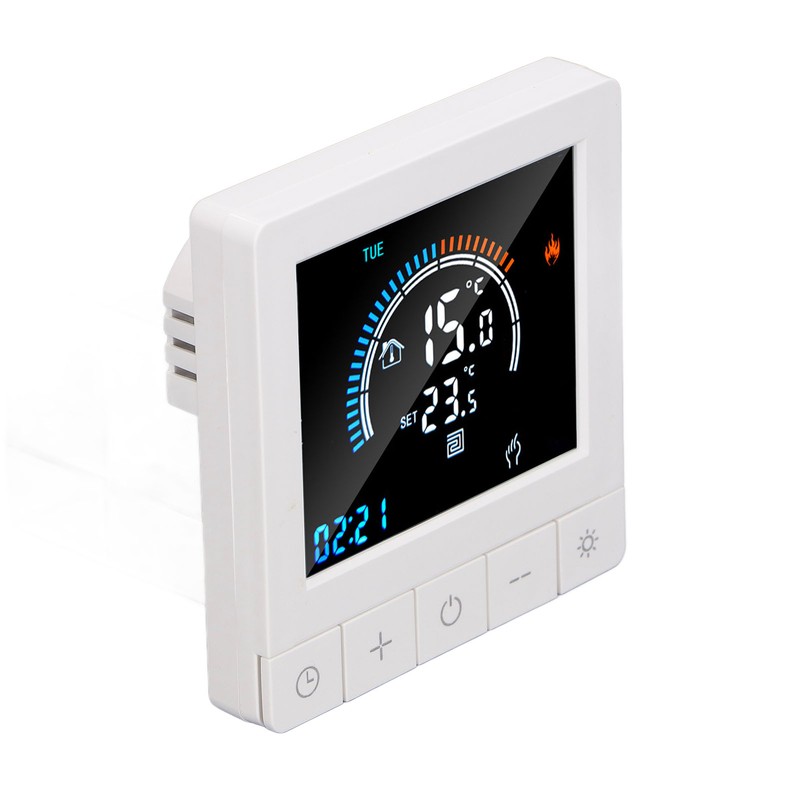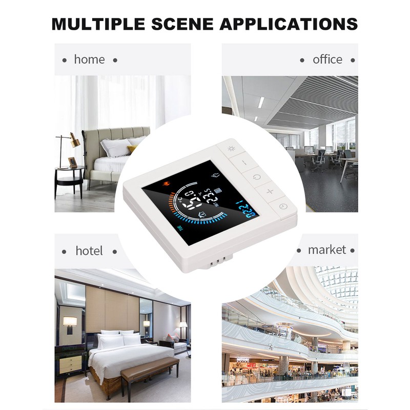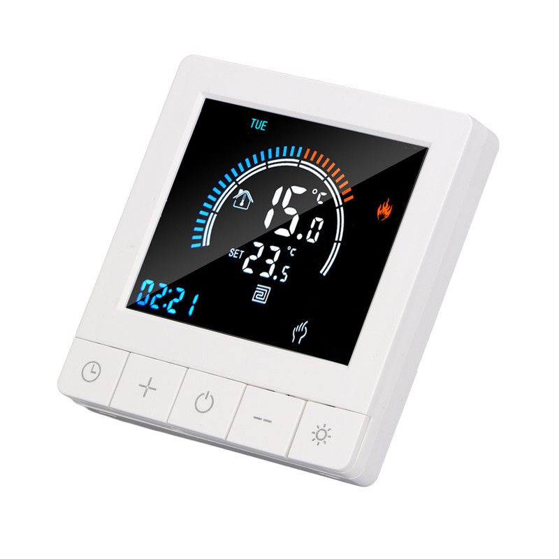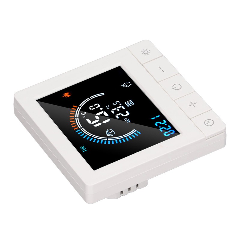 1、Intelligent LCD Display: This smart thermostat is equipped with a LCD display screen, which can clearly display information such as the current room temperature, set temperature, and working mode, making operation more intuitive and convenient. 2、Programming Function: This smart thermostat has programming function, allowing users to set different temperatures at different time periods according to their own needs, intelligently controlling floor heating, improving comfort while saving energy. 3、Intelligent Temperature Control: This programmable smart thermostat is designed specifically for smart homes and can accurately control the floor heating temperature to avoid overheating or overcooling, providing a comfortable indoor environment. 4、Widely Applicable: This programmable smart thermostat is suitable for various places such as homes, offices, shopping malls, hotels, nursing homes, etc., and can meet the needs of different places for floor heating temperature control. 5、Practical And Decorative: This smart thermostat for home has a beautiful appearance and is equipped with a color LCD display, which is not only practical but also decorative, adding a sense of fashion to the place.