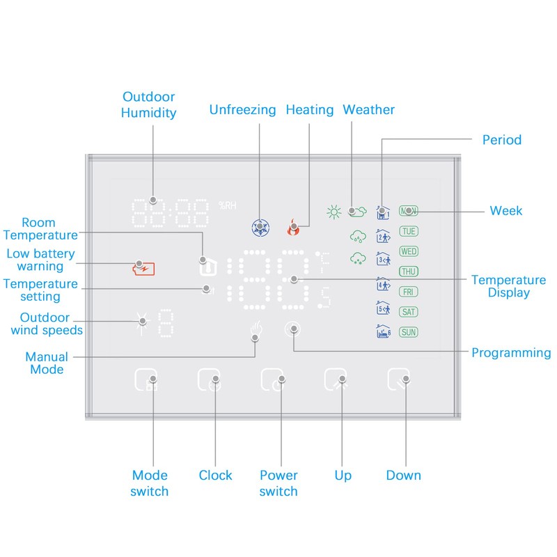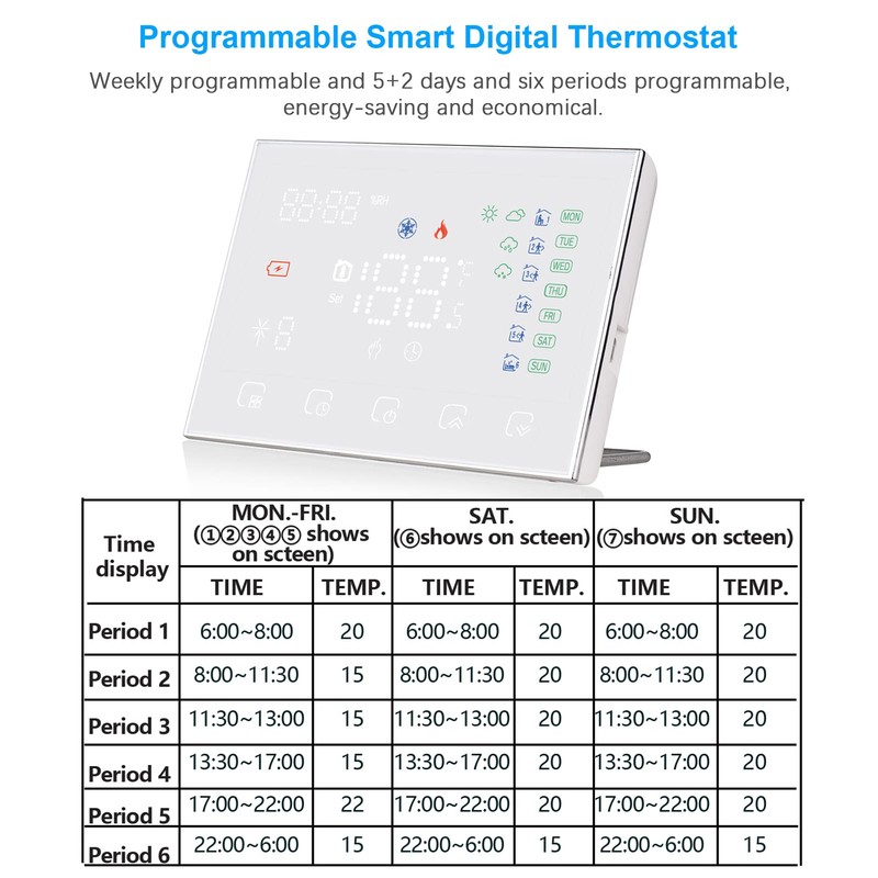 - 💡[Smart Programmable Thermostat] Weekly programmable and 5+2 days and six periods programmable, energy-saving and environmentally friendly, intelligent and economical.