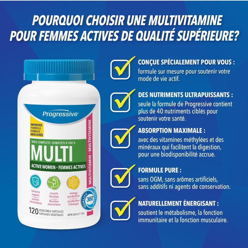 - DAILY MULTIVITAMIN FOR ACTIVE WOMEN: NEW Progressive 100% Complete Premium MultiVitamin for Active Women is designed for women on the go with essential nutrients to help support an active lifestyle and provide that boost of extra energy. Whether you exercise regularly, work long hours, raise a family or any combination of the above, your body needs the support of an Active MultiVitamin formula.