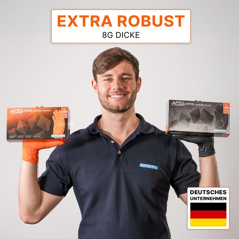- Extra thick disposable gloves: the Progrip Nitrile Diamond from Arnova is at least 8 g. 2 x as thick as standard nitrile gloves for disposable use. The work gloves are therefore particularly durable, tear-resistant and protective during hard work