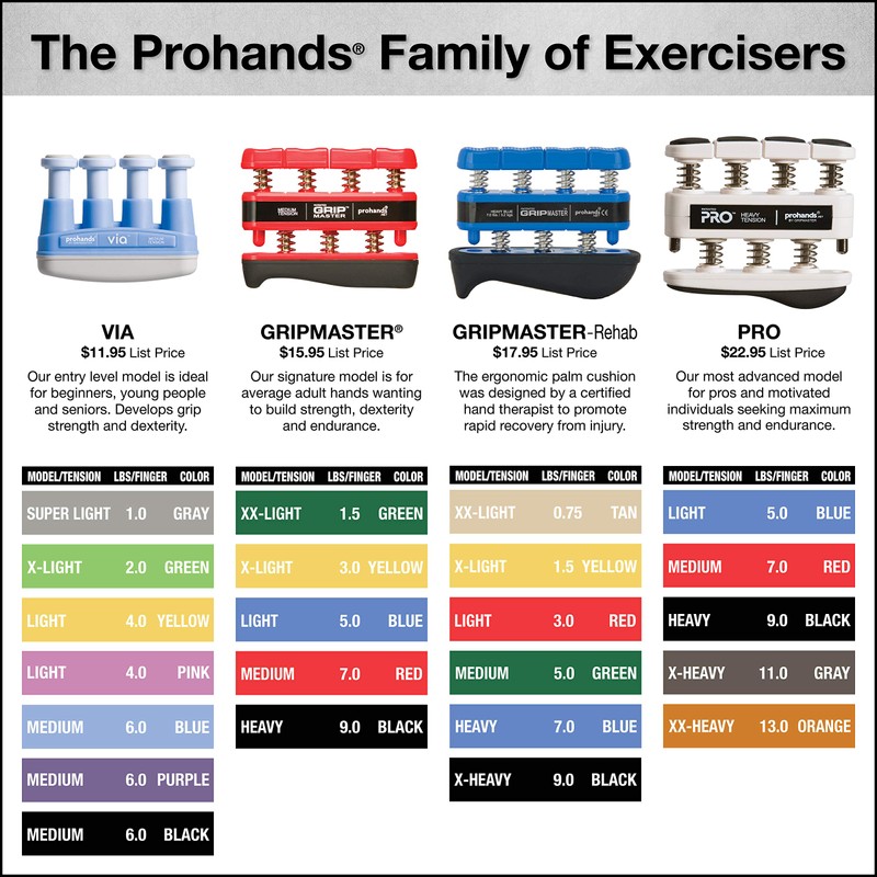 - THE PROHANDS FAMILY OF HAND EXERCISERS (2ND IMAGE): VIA is our entry-level model, GRIPMASTER is our signature model, GRIPMASTER-Rehab has an added palm cushion, and PRO is our most advanced model for pros and motivated individuals.
