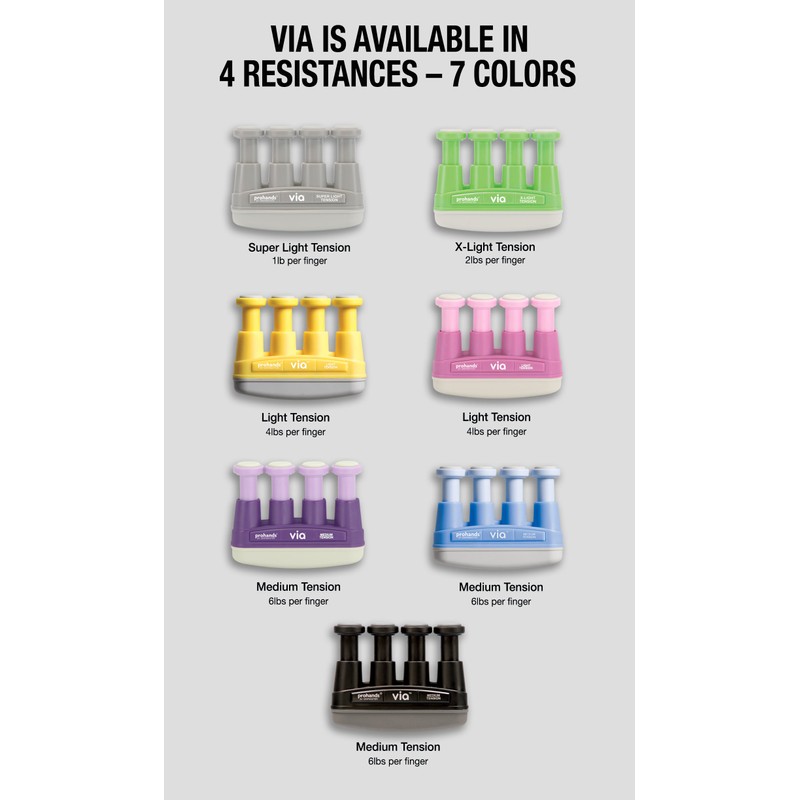 - THE PROHANDS FAMILY OF HAND EXERCISERS (2ND IMAGE): VIA is our entry-level model, GRIPMASTER is our signature model, GRIPMASTER-Rehab has an added palm cushion, and PRO is our most advanced model for pros and motivated individuals.