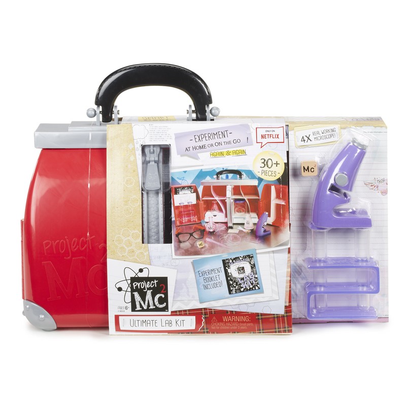Project Mc2 is a team of four super-smart and seriously cool girls who use their love of science and their spy skills as they go on missions for secret organization, NOV8 (that's “innovate”!). They're real girls with real skills ready to take on anything. Now an original series, only on Netflix! Conduct your own experiments at home or on the go, just like the girls from Project Mc2. The oversized lab "bag" unzips to reveal the Ultimate Lab Kit. Play with and store all the fun science pieces included. Picking up S.T.E.A.M. with Science-Technology-Engineering-Art-Math: So many different lab pieces for you to conduct chemistry and other science experiments. A real working microscope provides endless hours of discovery. Ready for more science experiments after you've mastered the ones included? Visit www.ProjectMc2.com. Product includes: - Real working microscope with 4x power - 30+ additional pieces, including 3 glass slides, 2 test tubes with stand, funnel, beaker jar, 3 lab flasks, 15 pH strips, pipette dropper, petri dish, safety goggles, Project Mc2 ring, and 2 sticker sheets to examine and decorate - Conduct 15+ different experiments from the included booklet or create some of your own!