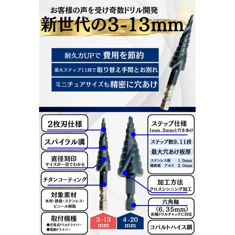 - Product specifications: odd drill (11 levels): 0.1 - 0.5 inches (3 - 13 mm), 0.1 inch (3, 4, 5, 6, 7, 8, 9, 10, 11, 12, 13 mm), 0.1 - 0.8 inches (4 - 20 mm)