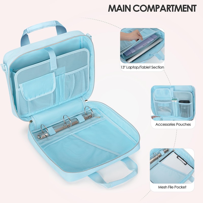 - PROFESSIONAL BINDER: The main compartment includes 2 separate sleeves with adhesive strap to fits 13” laptop, tablet and files. Additional 2 mesh pockets and 2 pen slots makes it easy to neatly store your highlighters, pencils, calculators, etc. (Empty Bag only, Not includes any accessories)