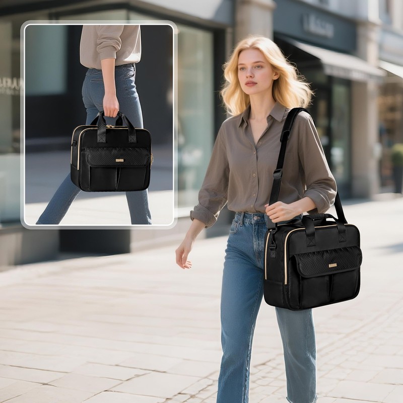 - CONVENIENT CARRYINGThe laptop bag is equipped with a reinforced top handle and a detachable, adjustable shoulder strap for comfortable carrying. Back trolley strap allows you to secure the briefcase on your luggage and move hands-free.