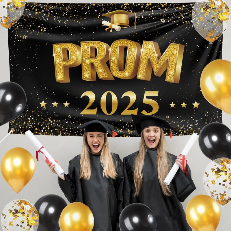 A 2025 prom banner and 12 pcs black gold balloons.