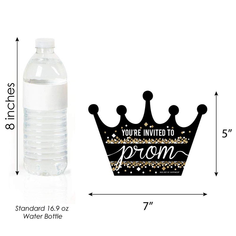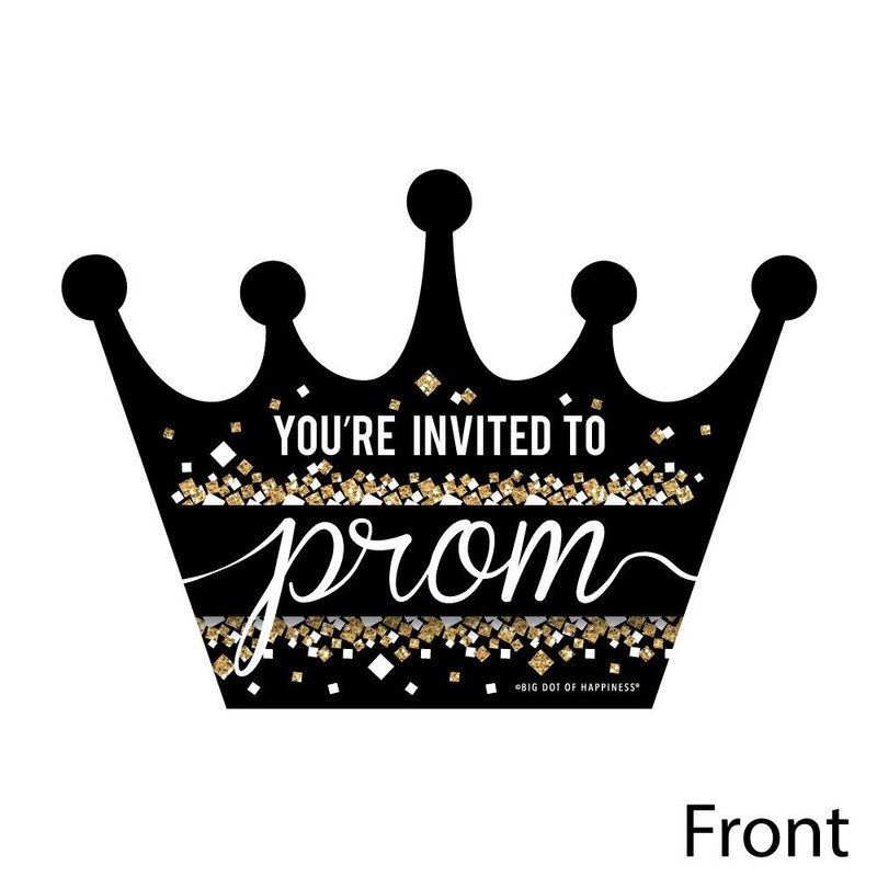 • Prom Fill-In the Blank Invitation Set INCLUDES 12 crown invitations and 12 premium white envelopes. Prom fill-in invitations are perfect for any event. The black and gold theme are great for a prom night party.