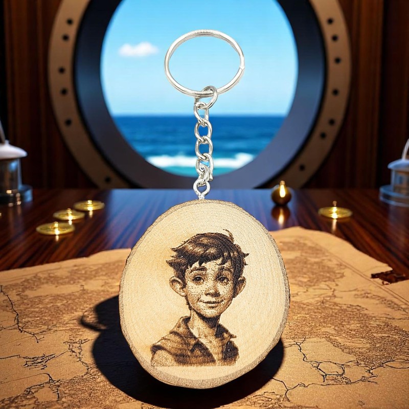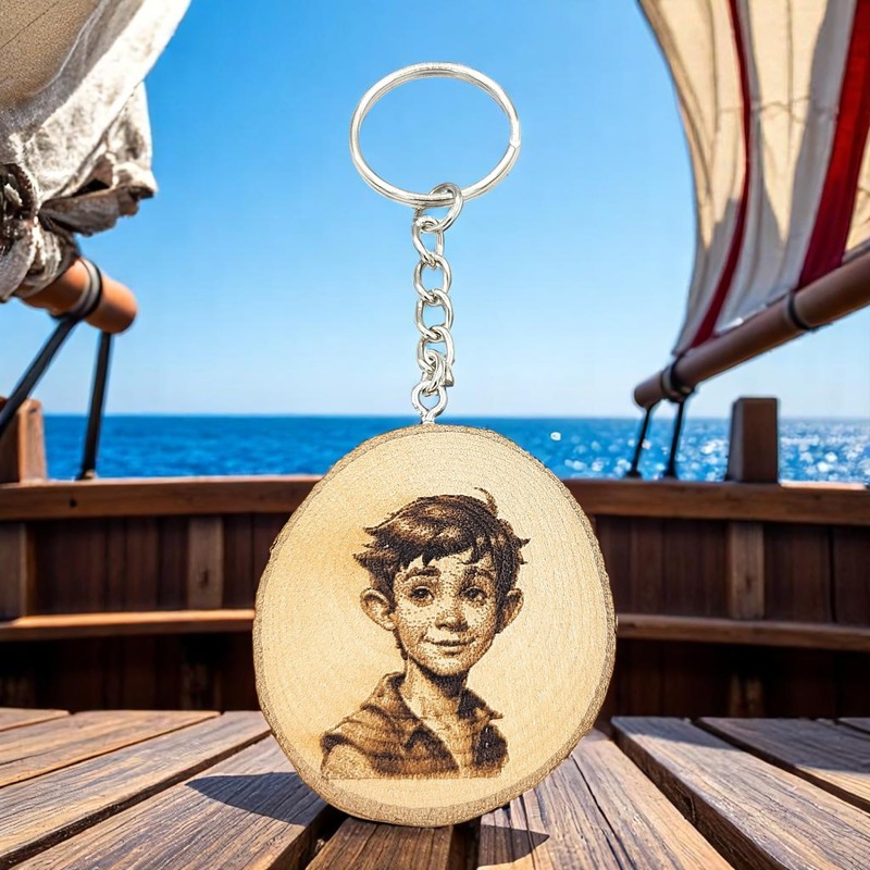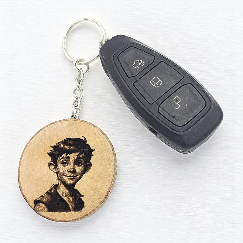 Promotech Peter Pan Handmade Laser Engraved Single Piece Natural Wood Keyring, natural wood