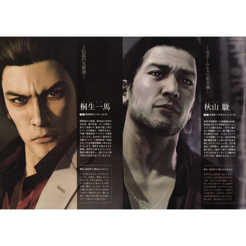 The second half of the magazine delves into the history of Ryu Ga Gotoku, interviews producer Toshihiro Nagoshi, checks out locales to visit with a city map, and checks out the hostesses who work at Club Shine and Club Jewel. The last two pages of the magazine list the items that may be found in every shop featured in the game.