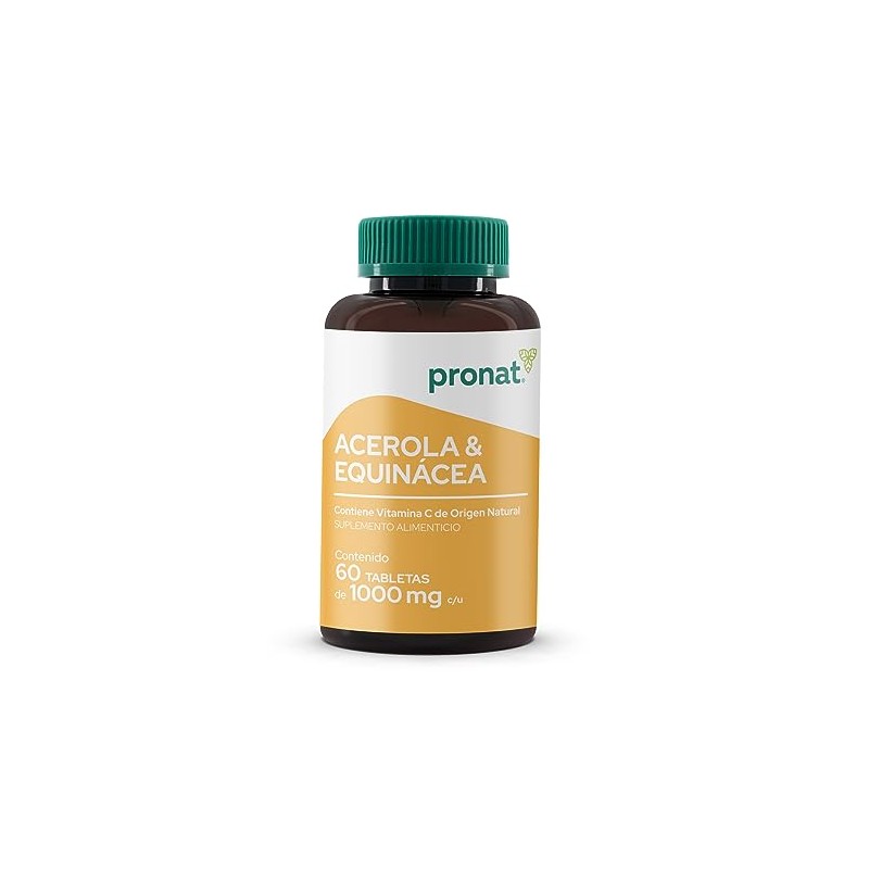 Acerca de este artículo LO QUE NECESITAS SABER. 60 tabletas de 1000 mg con Vitamina C de origen Natural, concentrado de Acerola y Equinácea. Para adultos y jóvenes mayores de 12 años INGREDIENTES DESTACADOS. Contiene 298 mg por porción de vitamina C de origen natural, 45 mg de equinácea y 300 mg de acerola BIENESTAR SIMPLE. Entendemos que llevar una vida sana puede ser complicado, por eso tenemos un portafolio enfocado en cada una de tus necesidades, simplificando tus elecciones. Te invitamos a averiguar sobre los beneficios de la vitamina C, la acerola y equinácea SIEMPRE TE RECORDAMOS. Este producto no es un medicamento. El consumo de este producto es responsabilidad de quien lo recomienda y de quien lo usa. Manténgase en un lugar fresco y fuera del alcance de los niños SOBRE PRONAT. Pronat es una marca con más de 45 años de experiencia en el mercado. Somos líderes en el segmento y ofrecemos productos de la más alta calidad, desarrollados en conjunto con nutriólogos y profesionales de la salud