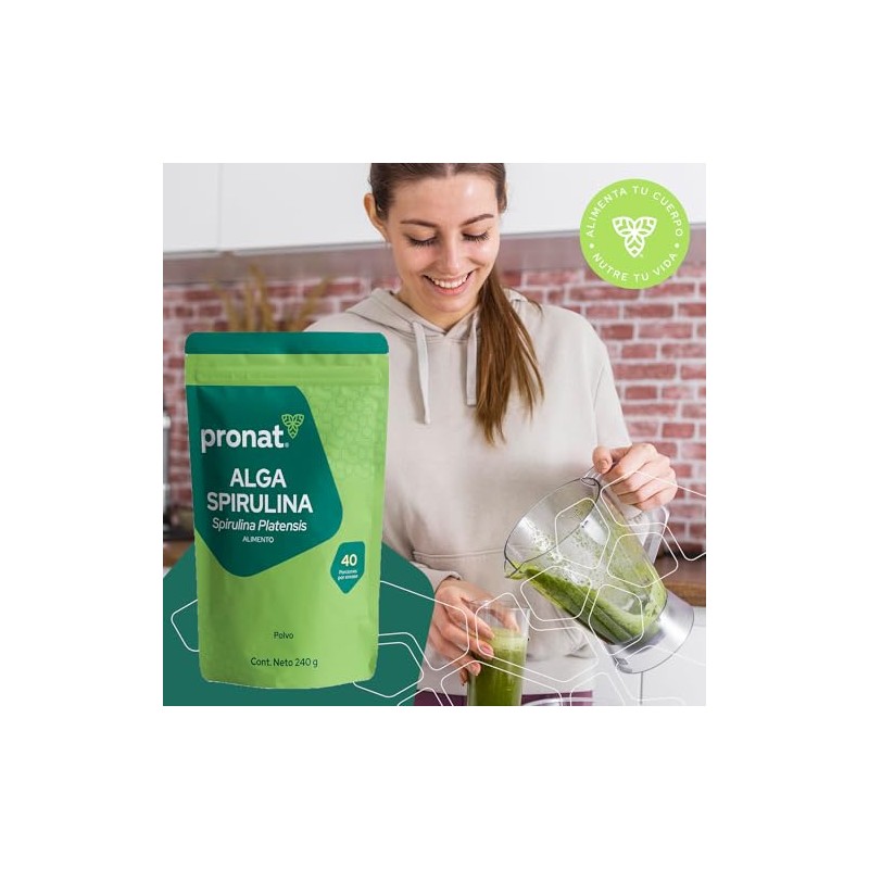 Acerca de este artículo LO QUE NECESITAS SABER. Bolsa con 240 gramos de Alga Spirulina 100% pura en polvo, ideal para licuados y smoothies, con nutrimentos auxiliares para una correcta alimentación en cualquier etapa de la vida. Es un producto no alérgeno y libre de gluten INGREDIENTES DESTACADOS. Aporta proteínas, clorofila, betacaroteno, vitamina E y vitaminas B1, B2, B3, B6, biotina y ácido fólico. Este producto se recomienda a partir de los 12 años BIENESTAR SIMPLE. Entendemos que llevar una vida sana puede ser complicado, por eso tenemos un portafolio enfocado en cada una de tus necesidades, simplificando tus elecciones. Te invitamos a averiguar sobre los beneficios del alga spirulina SIEMPRE TE RECORDAMOS. Este producto no es un medicamento. El consumo de este producto es responsabilidad de quien lo recomienda y de quien lo usa. Manténgase en un lugar fresco y fuera del alcance de los niños SOBRE PRONAT. Pronat es una marca con más de 45 años de experiencia en el mercado. Somos líderes en el segmento y ofrecemos productos de la más alta calidad, desarrollados en conjunto con nutriólogos y profesionales de la salud