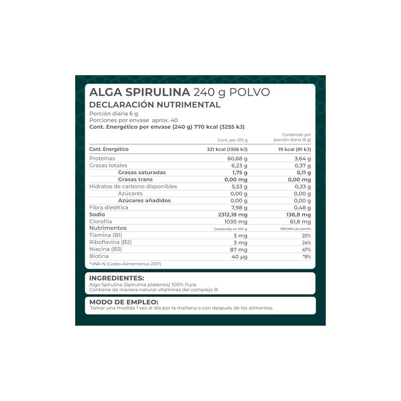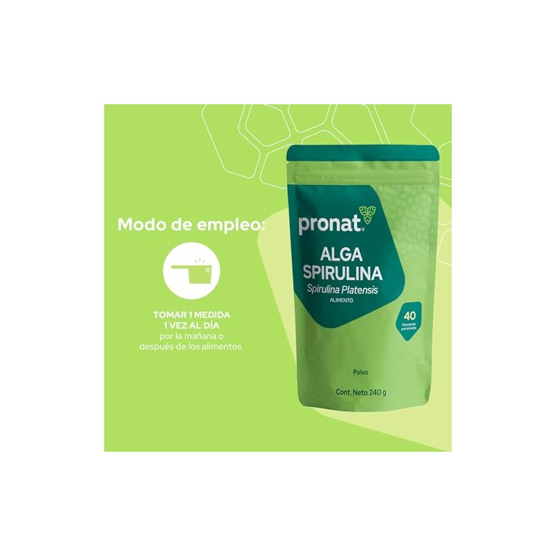 Acerca de este artículo LO QUE NECESITAS SABER. Bolsa con 240 gramos de Alga Spirulina 100% pura en polvo, ideal para licuados y smoothies, con nutrimentos auxiliares para una correcta alimentación en cualquier etapa de la vida. Es un producto no alérgeno y libre de gluten INGREDIENTES DESTACADOS. Aporta proteínas, clorofila, betacaroteno, vitamina E y vitaminas B1, B2, B3, B6, biotina y ácido fólico. Este producto se recomienda a partir de los 12 años BIENESTAR SIMPLE. Entendemos que llevar una vida sana puede ser complicado, por eso tenemos un portafolio enfocado en cada una de tus necesidades, simplificando tus elecciones. Te invitamos a averiguar sobre los beneficios del alga spirulina SIEMPRE TE RECORDAMOS. Este producto no es un medicamento. El consumo de este producto es responsabilidad de quien lo recomienda y de quien lo usa. Manténgase en un lugar fresco y fuera del alcance de los niños SOBRE PRONAT.