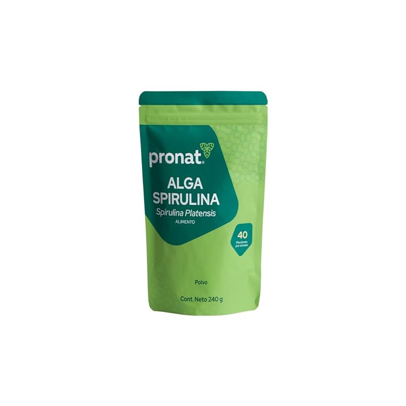 Acerca de este artículo LO QUE NECESITAS SABER. Bolsa con 240 gramos de Alga Spirulina 100% pura en polvo, ideal para licuados y smoothies, con nutrimentos auxiliares para una correcta alimentación en cualquier etapa de la vida. Es un producto no alérgeno y libre de gluten INGREDIENTES DESTACADOS. Aporta proteínas, clorofila, betacaroteno, vitamina E y vitaminas B1, B2, B3, B6, biotina y ácido fólico. Este producto se recomienda a partir de los 12 años BIENESTAR SIMPLE. Entendemos que llevar una vida sana puede ser complicado, por eso tenemos un portafolio enfocado en cada una de tus necesidades, simplificando tus elecciones. Te invitamos a averiguar sobre los beneficios del alga spirulina SIEMPRE TE RECORDAMOS. Este producto no es un medicamento. El consumo de este producto es responsabilidad de quien lo recomienda y de quien lo usa. Manténgase en un lugar fresco y fuera del alcance de los niños SOBRE PRONAT. Pronat es una marca con más de 45 años de experiencia en el mercado. Somos líderes en el segmento y ofrecemos productos de la más alta calidad, desarrollados en conjunto con nutriólogos y profesionales de la salud