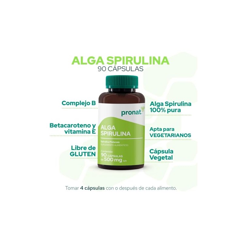 Acerca de este artículo LO QUE NECESITAS SABER. 90 cápsulas de 500 mg de Alga Spirulina 100% pura en cápsula vegetal, con nutrientes para una correcta alimentación en cualquier etapa de la vida. Es un producto no alérgeno y libre de gluten INGREDIENTES DESTACADOS. Aporta proteínas, clorofila, betacaroteno, vitamina E y vitaminas B1, B2, B3, B6, biotina y ácido fólico. Este producto se recomienda a partir de los 12 años BIENESTAR SIMPLE. Entendemos que llevar una vida sana puede ser complicado, por eso tenemos un portafolio enfocado en cada una de tus necesidades, simplificando tus elecciones. Te invitamos a averiguar sobre los beneficios del alga spirulina SIEMPRE TE RECORDAMOS. Este producto no es un medicamento. El consumo de este producto es responsabilidad de quien lo recomienda y de quien lo usa. Manténgase en un lugar fresco y fuera del alcance de los niños SOBRE PRONAT. Pronat es una marca con más de 45 años de experiencia en el mercado. Somos líderes en el segmento y ofrecemos productos de la más alta calidad, desarrollados en conjunto con nutriólogos y profesionales de la salud