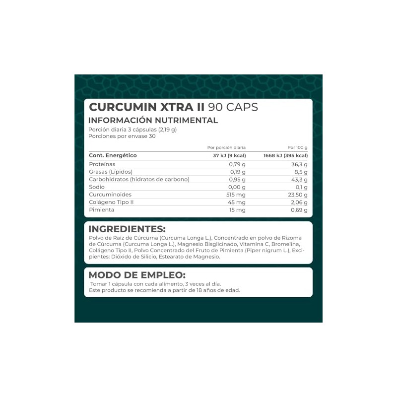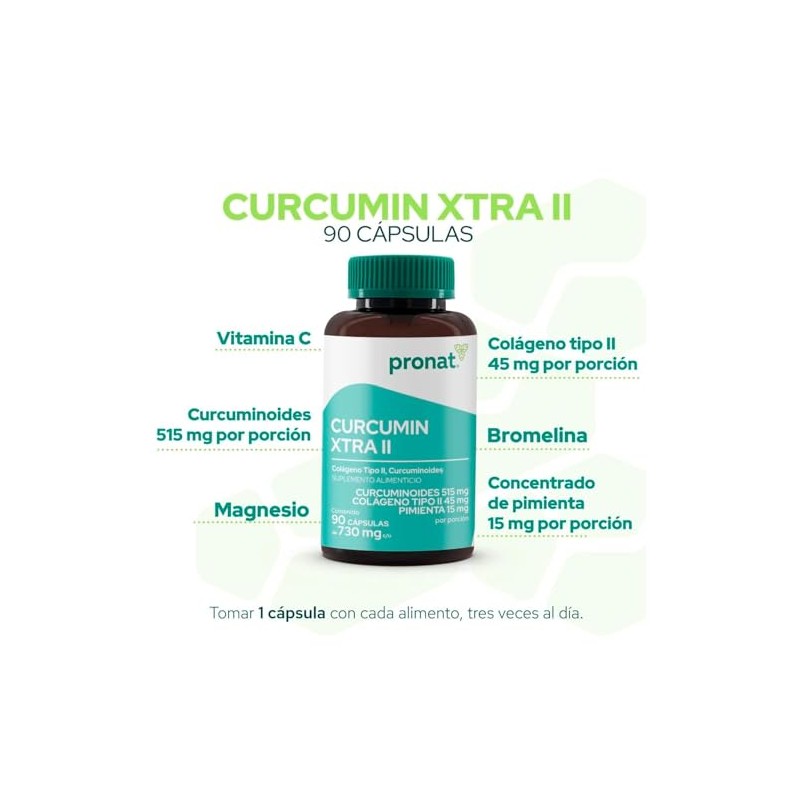 Acerca de este artículo LO QUE NECESITAS SABER. 90 cápsulas de 730 mg con una mezcla de Curcuminoides, Colágeno Tipo II y otros ingredientes naturales auxiliares en un estilo de vida y alimentación balanceada. Este producto se recomienda a partir de los 18 años INGREDIENTES DESTACADOS. Fórmula especialmente diseñada con 515 mg por porción de curcuminoides, 45 mg de colágeno tipo II, 15 mg de pimienta, además de magnesio, vitamina C y bromelina BIENESTAR SIMPLE. Entendemos que llevar una vida sana puede ser complicado, por eso tenemos un portafolio enfocado en cada una de tus necesidades, simplificando tus elecciones. Te invitamos a averiguar sobre los beneficios de los curcuminoides y el colágeno tipo II SIEMPRE TE RECORDAMOS. Este producto no es un medicamento. El consumo de este producto es responsabilidad de quien lo recomienda y de quien lo usa. Manténgase en un lugar fresco y fuera del alcance de los niños SOBRE PRONAT. Pronat es una marca con más de 45 años de experiencia en el mercado. Somos líderes en el segmento y ofrecemos productos de la más alta calidad, desarrollados en conjunto con nutriólogos y profesionales de la salud