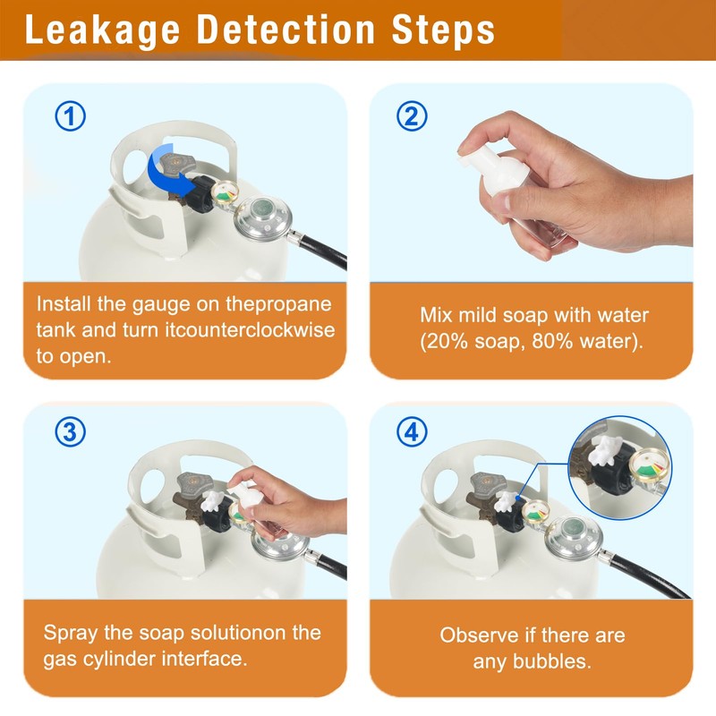 - Complimentary bottle for leak test: Leaking can also be caused by a bad connection or propane tank,to check the tank, inspect the inside of the gasket for cracks or misshaping oval shape,You can easily make a bubble water test with our complimentary small bottle to the valve where the regulator connects and open the valve bubbles will form where there is a leak