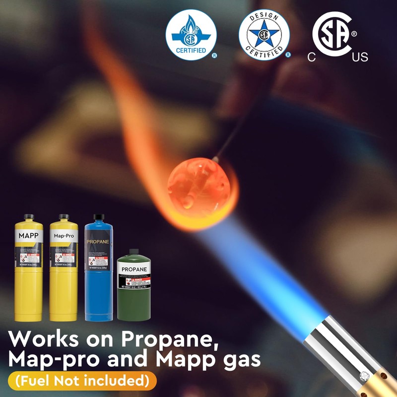- 【Exceptional Performance Welding Torch】 The Soldering Torch boasts cutting-edge self-ignition technology, facilitating rapid and safe ignition of the flame. It is ideally compatible with Propane, MAPP, and MAP-PRO fuels (not included).Furthermore, the gas valve knob is enveloped in a rubberized coating, enhancing comfort and ergonomics during operation.