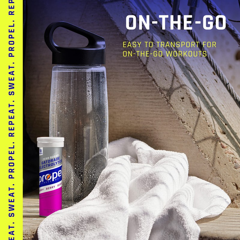 - Drop the Propel Tablet into a refillable water bottle with 15-20oz of water, and let fizz until tablet dissolves1`