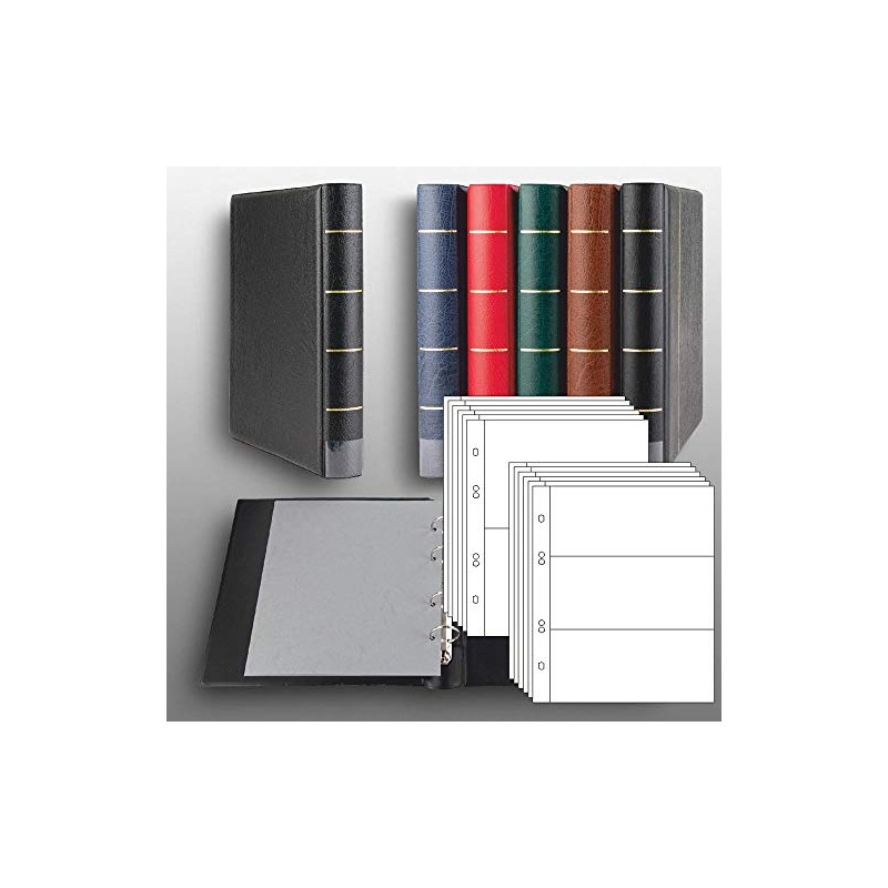 Your collectibles unfold all their splendor in these luxury ring binders. They allow you to organize your collection clearly. The banknote sleeves are transparent on both sides. With 20 double-sided transparent sleeves for a total of 50 banknotes. Contains 10 sleeves with 2 compartments 180 x 115 mm and 10 sleeves with 3 compartments 180 x 80 mm. Padded faux leather cover. Decorative gold stamping Viewing window for labelling in the spine of the album. Size: approx. 245mm x 270mm 4-ring mechanism 45-65-45 mm.