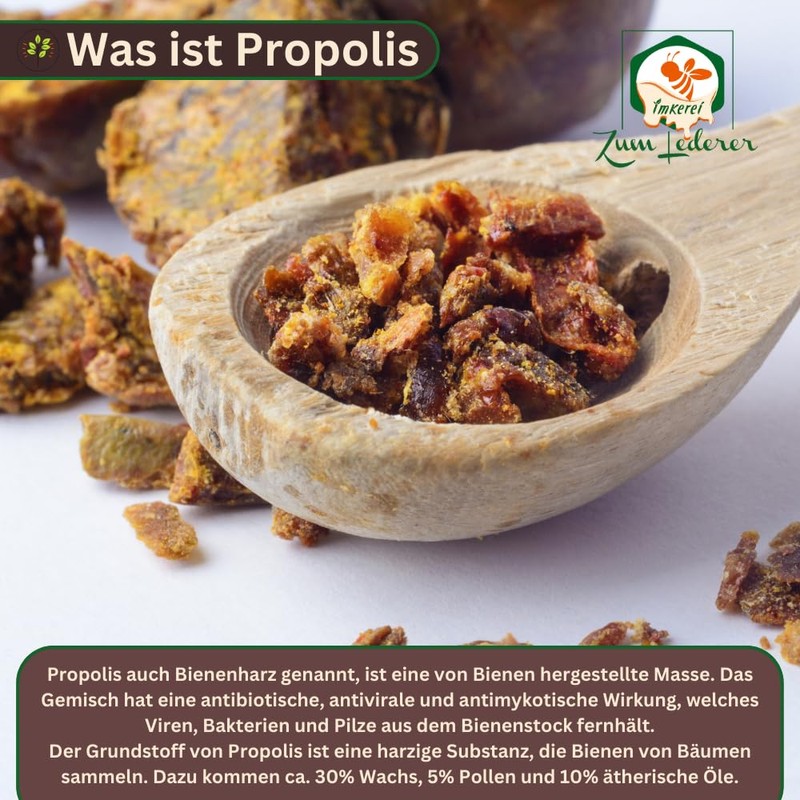 • Premium – the pure and untreated natural product is processed with love by a beekeeping. Propolis from the German forest.