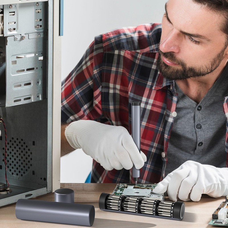 - 【60-in-1 Electric Screwdriver】This precision electric screwdriver is an essential for anyone passionate about electronics. It effortlessly handles assembly, disassembly, and repairs on devices for laptops, phones, watches, cameras, drones, glasses, remote control to other precision equipment. The portable set also includes a metal crowbar, flat tweezers, and neatly organized replaceable heads in a durable pop-up magnetic storage box.