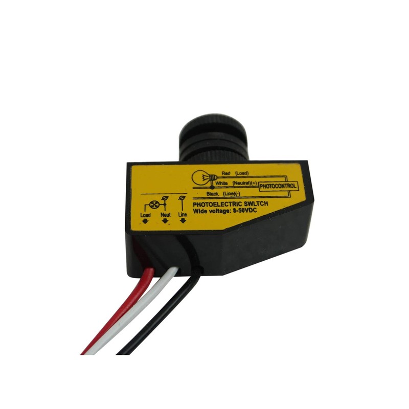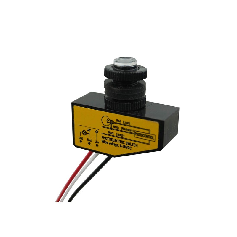 - Automatic DC 12V 24V 36V 48V photocell switch for outdoor lights - with sensor photoelectric system, turns lights on at dusk and off at dawn automatically; wide voltage input range DC 8V-50V; rated loading 3.5A