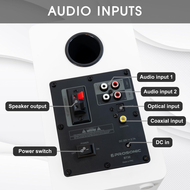 Prosonic BT30 Active Powered Bluetooth Bookshelf Speakers, Studio Monitor, Home Theater, Turntable, with Optical Input, Coaxial Input, 2X RCA Aux Line Input, 80 Watts, (White) (Renewed)