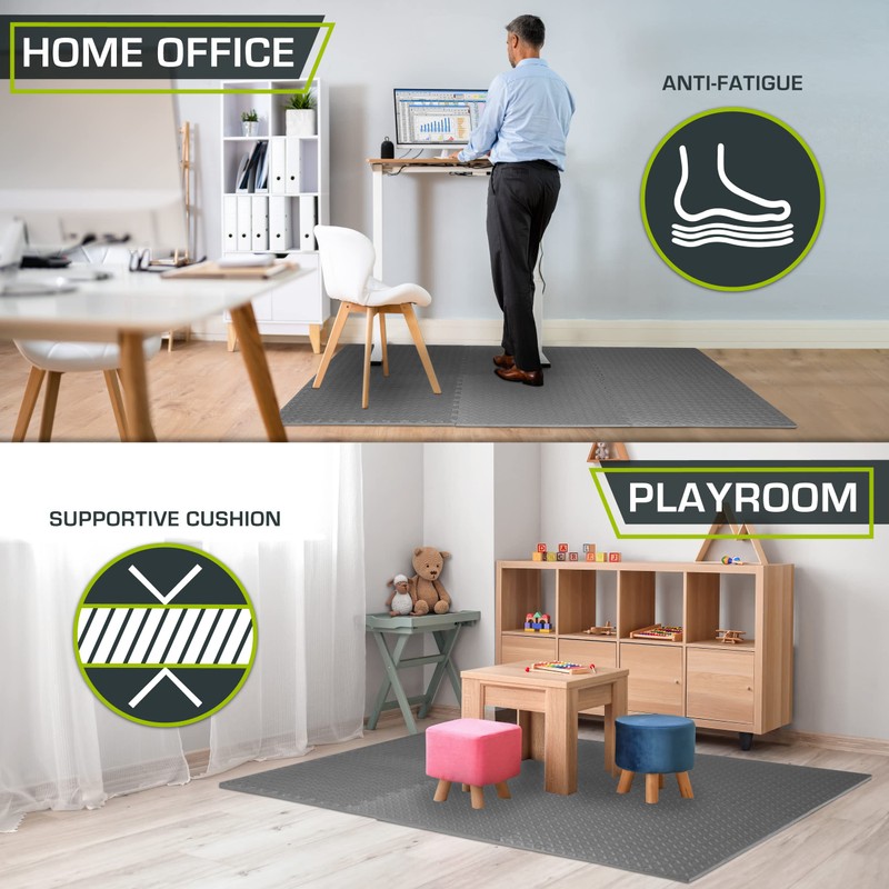 - Versatile C The water-resistant, noise-reducing design is easy-to-clean, great for indoor purposes like in garages as a protector, gyms, a home fitness room, or even children's play areas as a playmat.