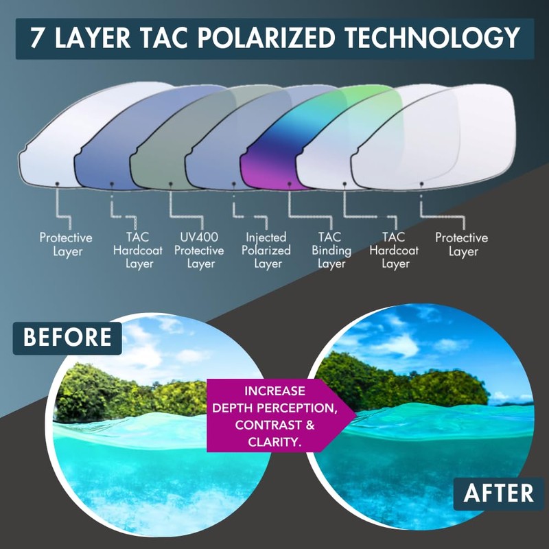 - TAC POLARIZED LENSES: Polarized Bifocal Sunglasses eliminates glare from shiny objects such as chrome bumpers, windows, mirrors, and water. New technology TAC (Tri Acetate Cellulose) polarized lenses offer superior visual and polarization clarity. They are hard coated to resist scratching and block out 100% of all harmful UV rays up to 400 nanometers. Experience ultimate color clarity and visual comfort with the Sharkbait Polarized Bifocals.