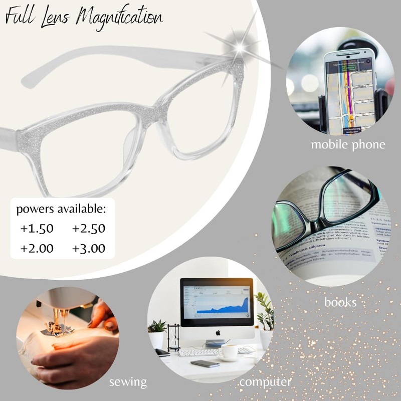 - INCLUDES EXQUISITE SOFT GLITTER CASE: The cutest case for the most exquisite reading glasses. This sparkling glitter case matches your magnified readers for ladies. Soft padded case will protect your readers in your purse, makeup bag or jacket pocket.