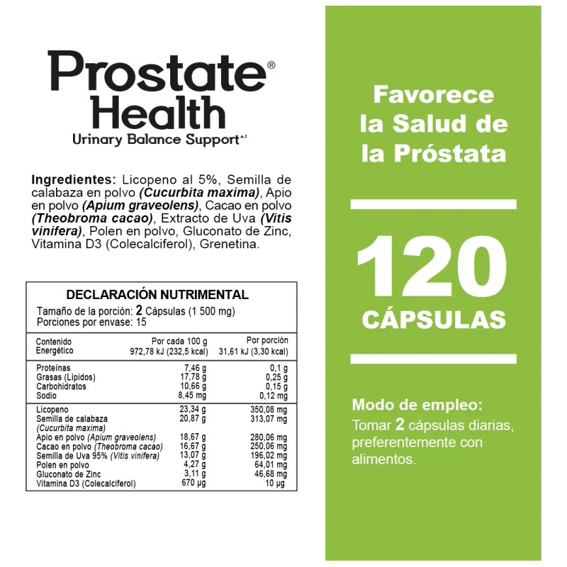 Naturelab® Prostate Health® es un suplemento para la próstata que incluye Saw Palmetto, extracto de Ciruela Africano, Semilla de Calabaza, Ortiga, Extracto de fruto de Guarana, Zinc, Vitamina D3. Estos ingredientes son reconocidos por sus propiedades que pueden contribuir a la protección del organismo en procesos inflamatorios y ser útiles como tratamiento complementario para la hiperplasia benigna de próstata.